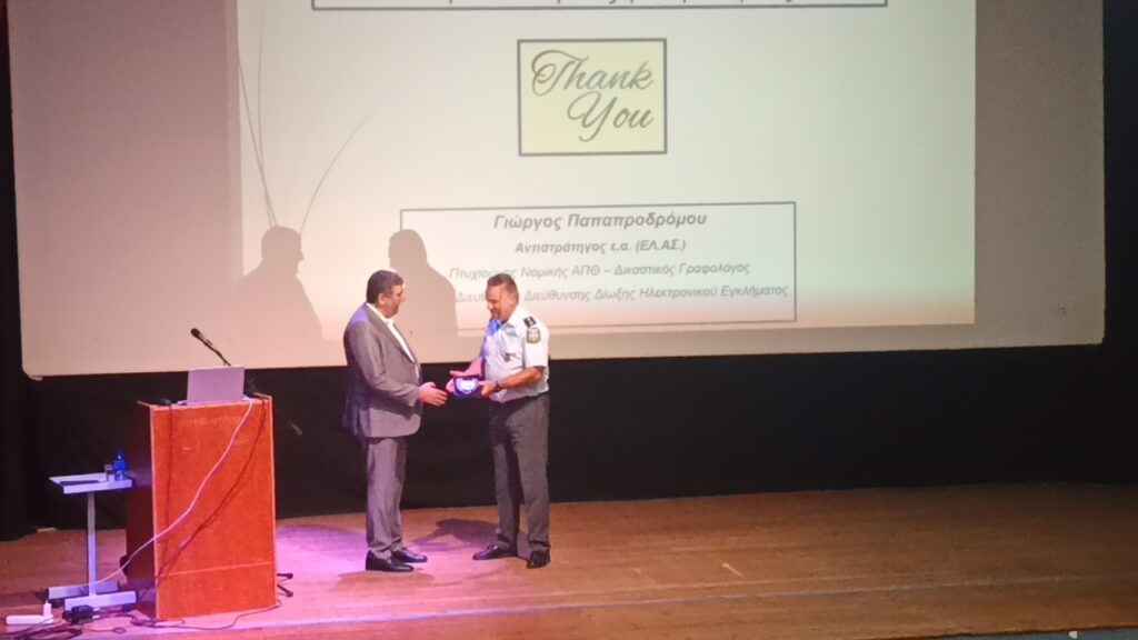 Ο κεντρικός ομιλητής ήταν ο Αντιστράτηγος ε.α. της Ελληνικής Αστυνομίας, Γεώργιος Παπαπροδρόμου, με μεγάλη εμπειρία στον χώρο της Δίωξης Ηλεκτρονικού Εγκλήματος.