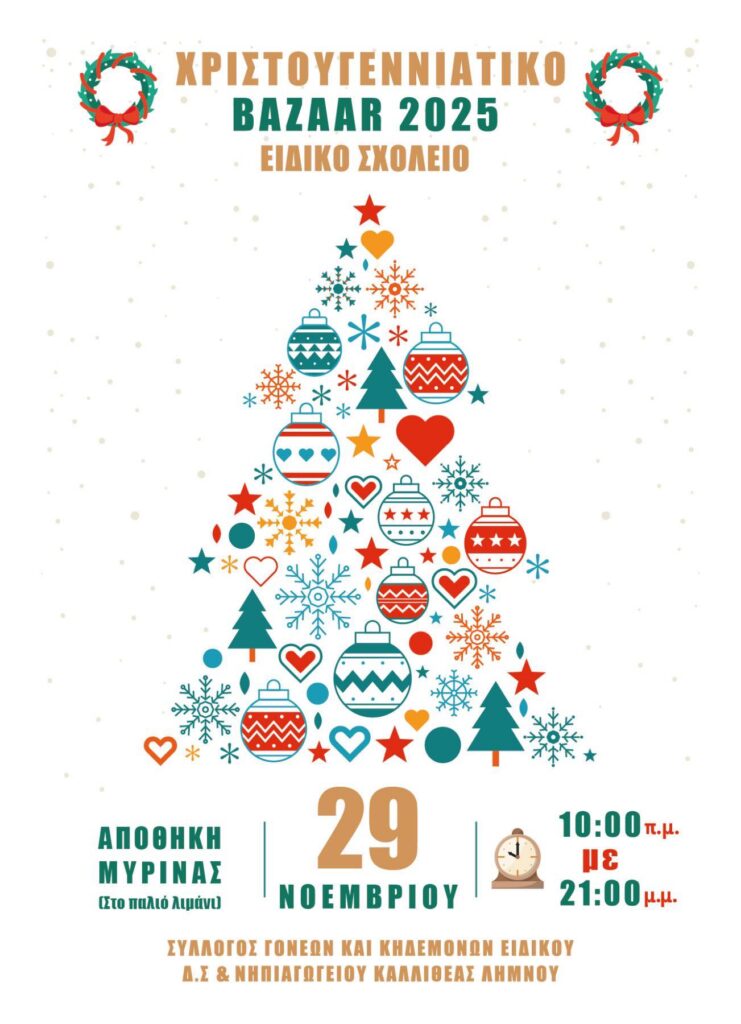 Με τη μαγεία των Χριστουγέννων να πλησιάζει, ο Σύλλογος Γονέων και Κηδεμόνων του Ειδικού Δημοτικού και Νηπιαγωγείου Καλλιθέας Λήμνου διοργανώνει Χριστουγεννιάτικο Bazaar 2025, μια ζεστή γιορτή προσφοράς και δημιουργίας, ανοιχτή σε μικρούς και μεγάλους.