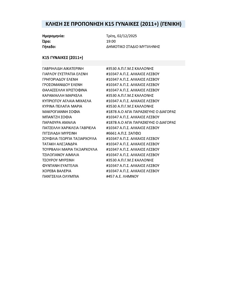 Η Ε.Π.Σ. Λέσβου προσκαλεί τις παρακάτω αθλήτριες σωματείων Λέσβου και Λήμνου, να παρευρεθούν στην προπόνηση της Μικτής Ομάδας Γυναικών .