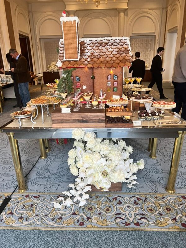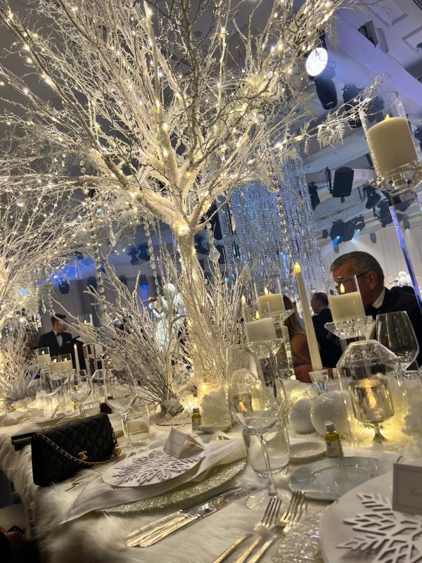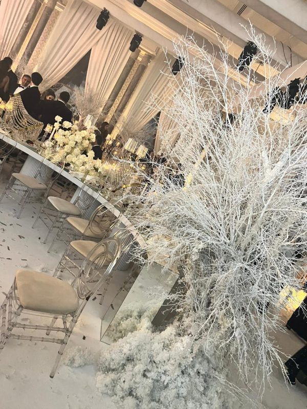 Μετά το Ιερό Μυστήριο, στο οποίο κουμπάρος ήταν φίλος του ζευγαριού, οι καλεσμένοι μεταφέρθηκαν με βαν πίσω στο ξενοδοχείο, στην αίθουσα, η οποία ήταν διακοσμημένη σαν παραμύθι. Με ολόλευκο φόντο και χορεύτριες – αγγέλους, στην υποδοχή, με καθρέφτες στο δάπεδο, λευκά λουλούδια, στρας και πέρλες. Εκεί έκανε εντυπωσιακή είσοδο το ζευγάρι, με τις μουσικές επιλογές του DJ Harris Panou. Στην αίθουσα αυτή το ζευγάρι έκοψε την τούρτα και χόρεψε τον χορό του, ενώ απόλαυσαν το κυρίως γεύμα τους οι προσκεκλημένοι επιλέγοντας κρέας ή ψάρι.