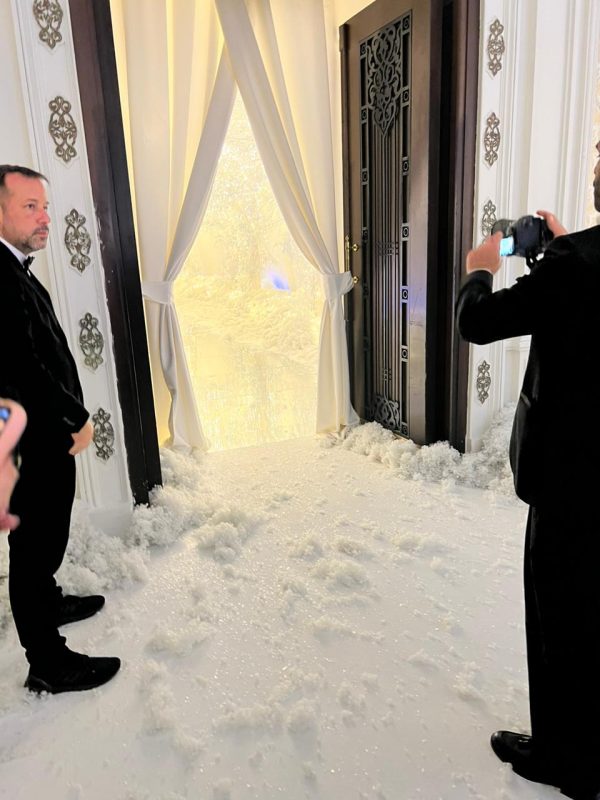 Η νύφη εντυπωσίασε με ένα πανάκριβο νυφικό στολισμένο εξ ολοκλήρου με Swarovski, μια δημιουργία που έκλεψε τα βλέμματα και τα φλας. Ο γαμπρός, κομψός και διαχρονικός, επέλεξε κλασικό μαύρο σμόκιν, υπογραμμίζοντας την αρχοντιά του ζευγαριού.