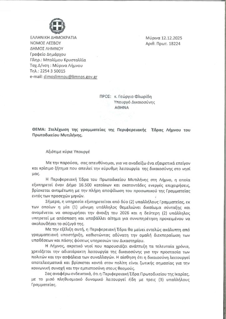 Η Δήμαρχος Λήμνου κ. Ελεονώρα Γεώργα απέστειλε επιστολή προς τον Υπουργό Δικαιοσύνης κ. Γεώργιο Φλωρίδη, στην οποία επισημαίνει τα σοβαρά προβλήματα που προκαλεί η αποψίλωση του προσωπικού της Γραμματείας της Περιφερειακής Έδρας στη Λήμνο του Πρωτοδικείου Μυτιλήνης.