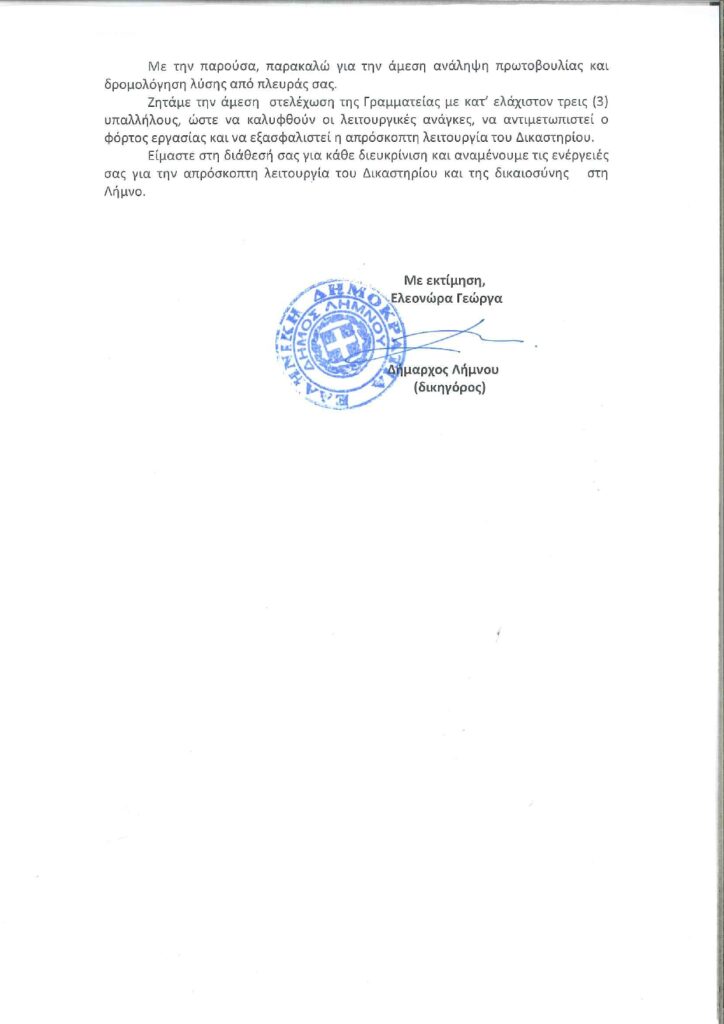Είμαστε στη διάθεσή σας για κάθε διευκρίνιση και αναμένουμε τις ενέργειές σας για την απρόσκοπτη λειτουργία του Δικαστηρίου και της δικαιοσύνης στη Λήμνο.