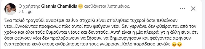 Τα μέσα κοινωνικής δικτύωσης έχουν πλημμυρίσει από σπαρακτικά μηνύματα αποχαιρετισμού και συμπαράστασης. Φίλοι, συμμαθητές και συμπολίτες του εκφράζουν τον πόνο τους για τον άδικο χαμό ενός παιδιού που «δεν πρόλαβε να ζήσει», κάνοντας λόγο για έναν άνθρωπο με ήθος, καλή καρδιά και αυθεντική αγάπη για τους γύρω του. Οι λέξεις μοιάζουν φτωχές μπροστά στη θλίψη, με κοινό παρονομαστή το ερώτημα «γιατί τόσο νωρίς».