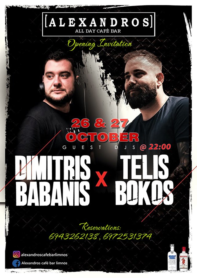Σήμερα Σάββατο 26 Οκτωβρίου (Αγίου Δημητρίου) το Alexandros All Day Café Bar ανοίγει τις πόρτες του ανανεωμένο και αναβαθμισμένο πλέον σε όλες τις παροχές των υπηρεσιών του, και σας προσκαλεί στον χώρο του υποδέχοντας ένα δυνατό δίδυμο αποτελούμενο από τους Djs Δημήτρη Μπαμπάνη & Τέλη Μπόκο.