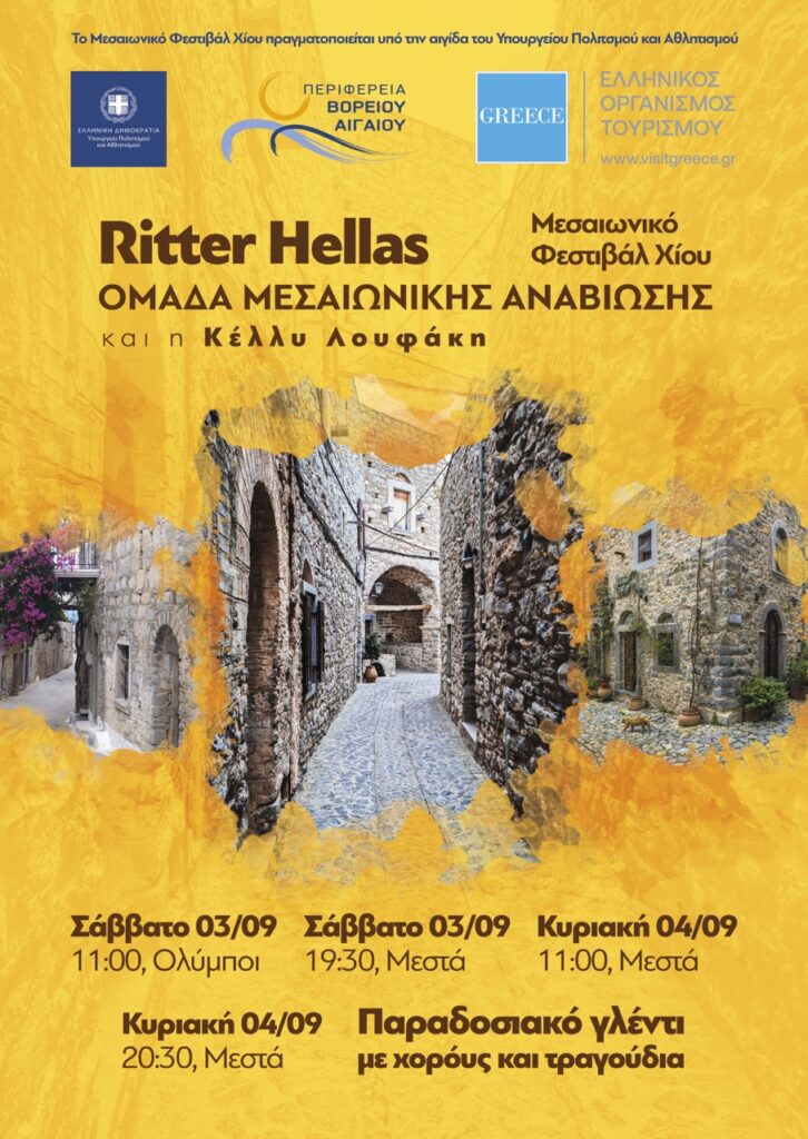 Το Σαββατοκύριακο 3 και 4 Σεπτεμβρίου πρωταγωνιστούν τα μοναδικής ομορφιάς μεσαιωνικά καστροχώρια: Ολύμποι και Μεστά, όπου θα ξεπηδήσουν στα σοκάκια τους ιππότες, πριγκίπισσες, κουρσάροι, ξιφομάχοι και μελωδοί. Στην πλατεία τόσο των Ολύμπων όσο και των Μεστών η 15μελης ομάδα μεσαιωνικής αναβίωσης Ritter Hellas θα μας μεταφέρει στο Μεσαίωνα με μια παράσταση ξεχωριστή, με έναν διασκεδαστικό τρόπο για μικρούς και μεγάλους.